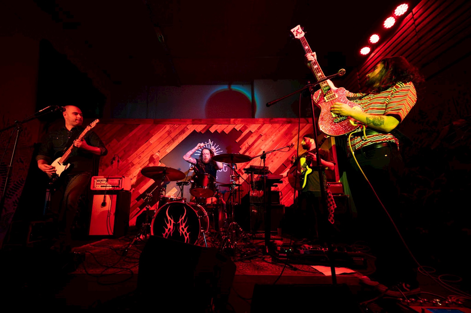 Het slotakkoord vanavond wordt verzorgd door GIAC TAYLOR, het soloproject van Giacomo Panarisi (Romano Nervoso) waarin het multitalent z’n zelfbenoemde spaghetti‑rock laat muteren tot heavy, maar dan ook écht heavy, stoner‑, desert‑ en doomrock. Ondersteund door een felle bas, knappe gitaarlijnen en toetsen, weet spilfiguur Giac(omo), die drumt én zingt, schijnbaar moeiteloos een directe en fysiek voelbare energie op te wekken. Aan bindteksten verspilt de band dan weer geen energie. Gaspedaal indrukken en gaan … De muziek klinkt als een mix van fuzzende riffs, logge grooves, felle drums en filmische synth‑lagen die de sfeer goed weet te vatten in een knappe spanningsopbouw. Klein minpuntje: ondanks vier (mee)zingende bandleden komt het vocale gedeelte iets te vaak in het gedrang, al weten de vier klasbakken het toegankelijk te houden zonder de zwaardere ondertoon te verliezen. GIAC TAYLOR brengt muziek met een eigen signatuur, woest en zonder compromissen. Geen wonder dat Danko Jones fan is.