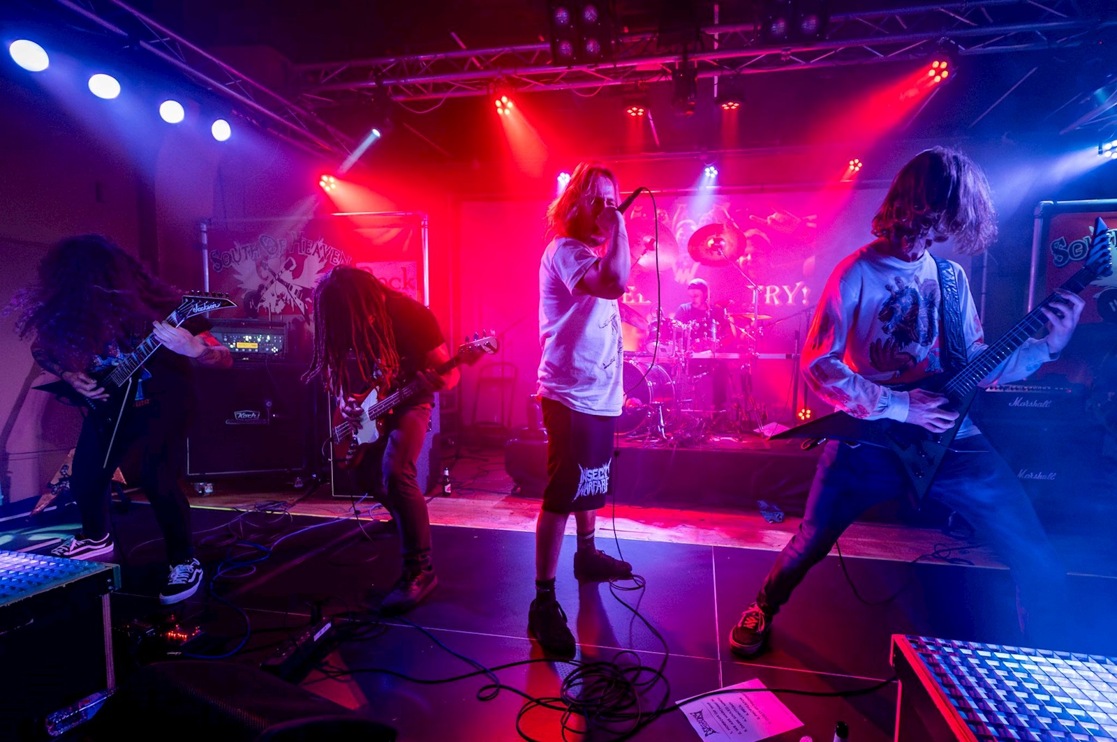 VAGEVUUR maakte de oversteek uit West‑Vlaanderen om South Of Heaven te confronteren met een constant dreigende geluidsmuur. De band wordt weleens weggezet als een ‘Amenra’-adept en daar kunnen we best inkomen. Toch steken er in de mix van gruizige sludge, blackgaze en beklemmende doom voldoende elementen om van een eigen interpretatie te spreken. Het gros van de songs kent een trage, atmosferische start die een beklemmende, maar intrigerende uitvalsbasis creëert voor de messcherpe uitbarstingen die geheid volgen. Hoewel frontman Thomas de aandacht naar zich toetrekt met afwisselend bedaarde en emotioneel krijsende uitlatingen, is het net de wisselwerking met de tweede stem van gitarist Arno die voor een donkere, meeslepende trip zorgt.