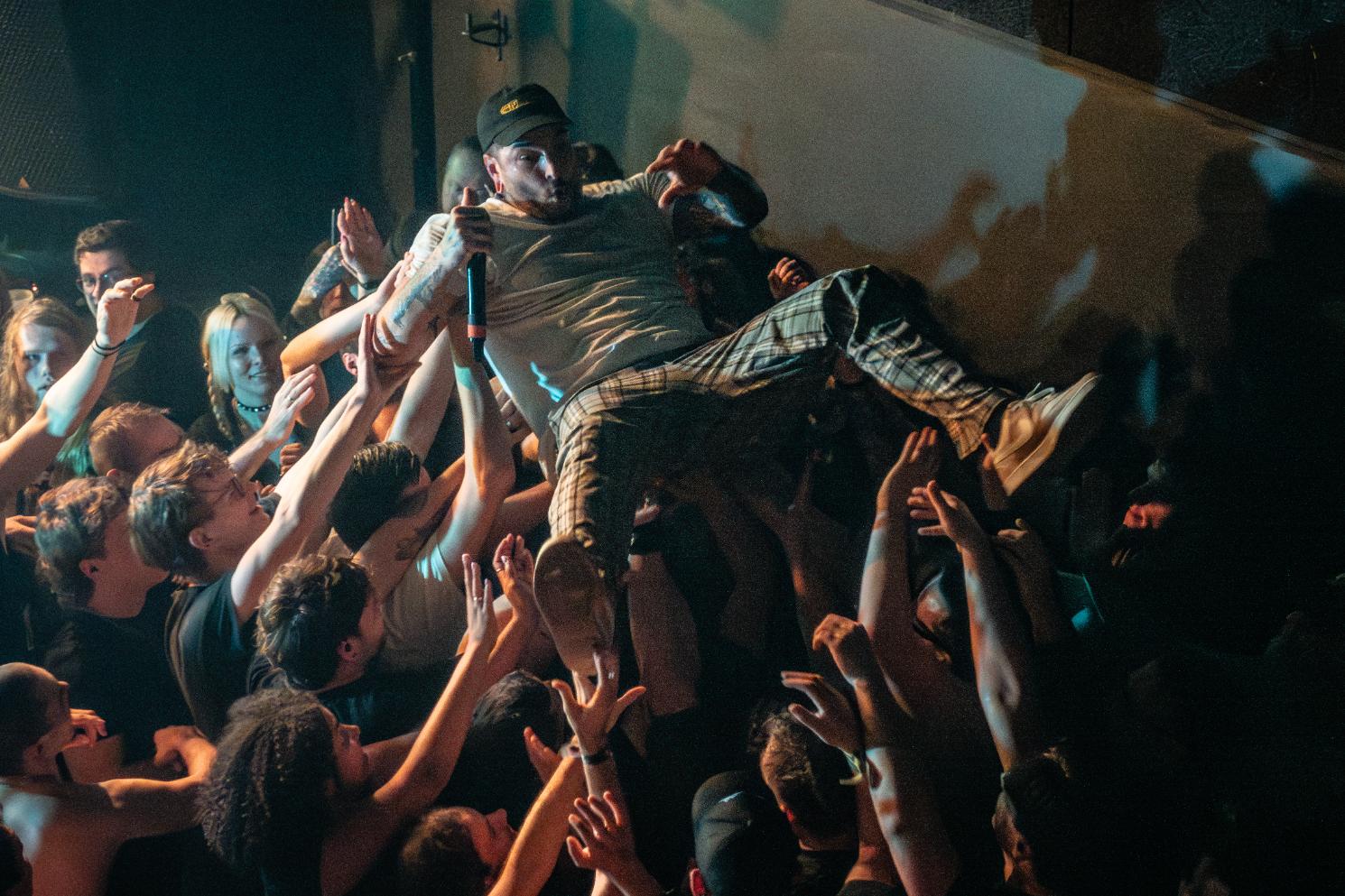 De boomlange zanger David Simonich, uitgedost in een broek met grote vierkanten en wit T-shirt, was een ideale entertainer, naar het einde van de set toe wierp hij zich op de handen van de gegadigden voor een rondje crowdsurfen door de zaal.