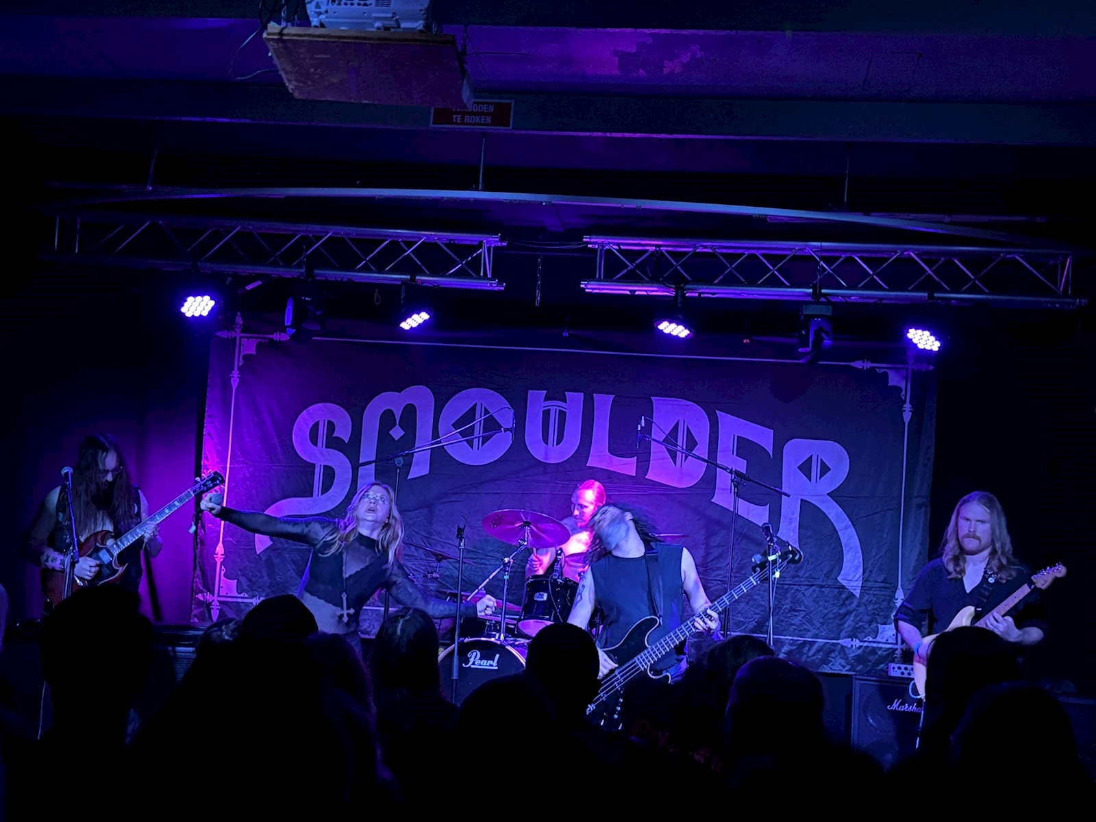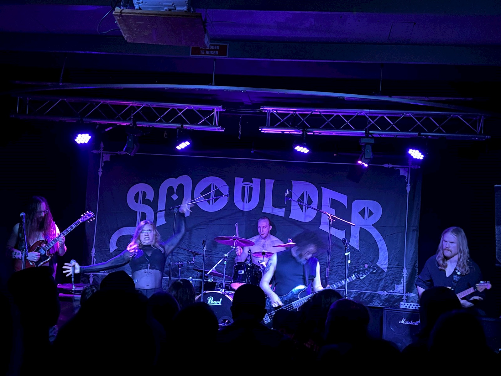 Oorspronkelijk zijn de heren en dame van SMOULDER (7) afkomstig uit Canada. Maar enkele jaren terug besloot de voltallige band te verhuizen richting Zweden. Dat zorgt er meteen voor dat het iets eenvoudiger is om door Europa te trekken. Dat het gros van de aanwezigen voor Dread Sovereign bleek te zijn gekomen, wordt al snel pijnlijk duidelijk als er maar weinig reactie komt na ‘Violent Creed Of Vengance’. De titeltrack van hun laatste album dat ondertussen ook alweer van 2023 dateert. Met ‘Crush The Neophytes’ krijgen we wel een voorsmaakje van hun nieuwe plaat die er ook volgend jaar zit aan te komen.