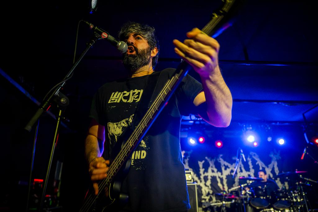 Mark ‘Barney’ Greenway van NAPALM DEATH (8) schreeuwt zich vanaf de eerste seconde nog steeds de ballen uit het lijf. De band trad aan met bassist Adam Clarkson, de bandmaat van gitarist John Cooke uit de band ‘Corrupt Moral Altar’. Volgens Barney hoeven we daar geen ‘conspiracy theory’ achter te zoeken, Shane (Embury) heeft gewoon, zoals iedereen dat wel eens heeft, wat tijd voor zichzelf nodig. Zijn terugkeer naar het podium is een zekerheid, aldus Barney. Napalm Death speelde ondertussen bijna traditiegetrouw eerst een resem songs die wat moeilijk te voorspellen zijn. ‘Every Day Pox’, ‘Contagion’ en het atypische ‘Amoral’ van het laatste album en onder andere het fantastische ‘Narcissus’ van de laatste EP. De handen gingen goed op elkaar en het leek alsof het publiek toch weer hoofdzakelijk voor deze grindcorelegende naar de Trix Club is getrokken.