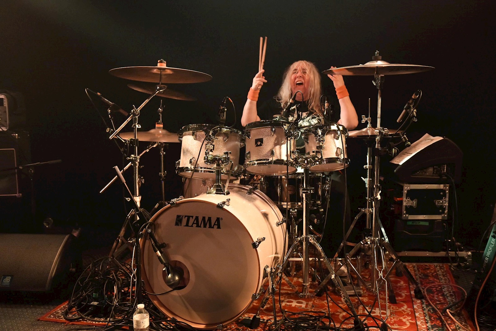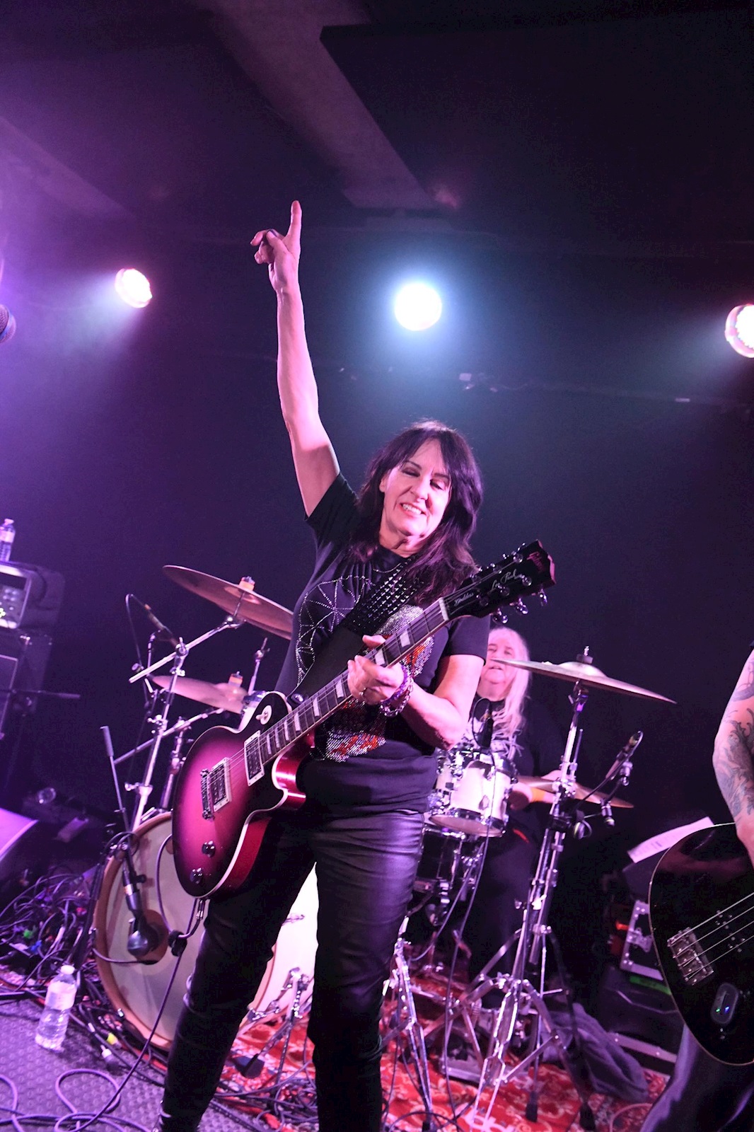 Afsluiter van de avond is GIRLSCHOOL, bijna een halve eeuw actief. Met zangeres/gitariste Kim McAuliffe en drumster Denise Dufort heeft de band nog twee originele leden die de zaak rechthouden. Al is dat laatste letterlijk wat moeilijker voor Kim die door aanhoudende rugproblemen wat wankel op de planken staat. Samen met gitariste Jackie Chambers en nieuwkomer Olivia Airey op bas brengen ze een old school set die teruggrijpt naar hun roots.