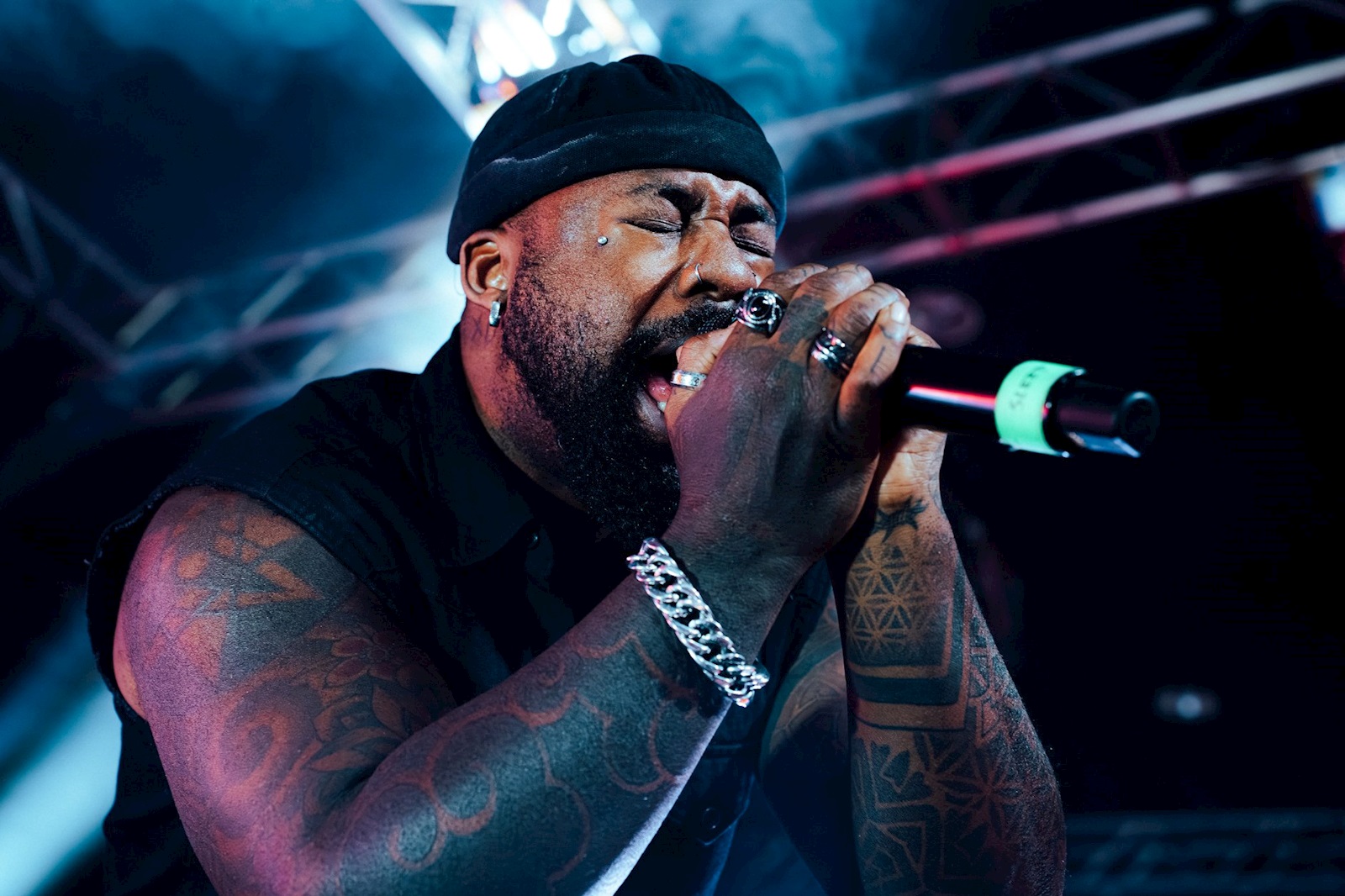 Met de hoofdmoot van vandaag zijn we minder bekend. Toch klinkt de naam SLEEP THEORY (7) ook bij het jonge volkje als een klok. Hun geschiedenis is eveneens vrij recent. Eigenlijk gestart in 2019 als een soort van soloding dat zanger Cullen Moore op poten zette. Die gast kan zingen, zoveel is duidelijk. Sleep Theory brengt een moderne metal sound en is daarbij niet vies om zo nu en dan wat RnB-klanken met dit alles te laten blenden. Oudere krijgers zoals wij staan daar een beetje sceptisch tegenover, maar de jeugd, die hier overduidelijk de meerderheid hebben, leeft zich volledig uit.