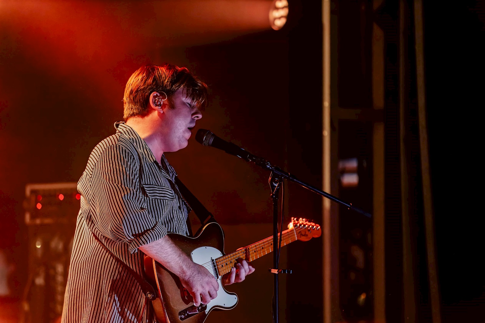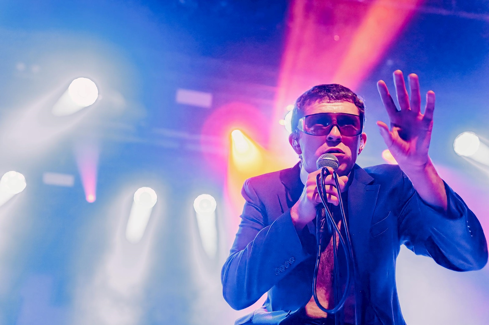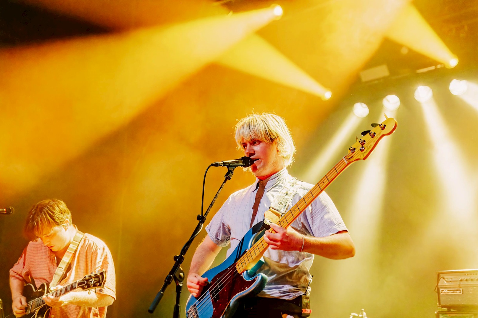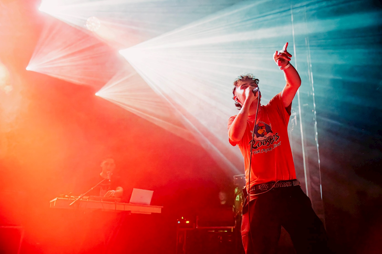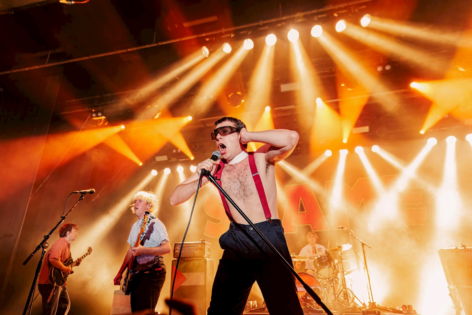 SHAME (8), een vijftal uit Londen, heeft recent een nieuwe plaat uit, getiteld ‘Cutthroat’. Het vierde in een rijtje. Deze komen ze vanavond aan ons voorstellen in een set die doorspekt is van de nieuwe nummers. Op de tonen van Barry Manilows ‘Copacabana’ komen de postpunkgladiatoren de arena binnengewandeld. Wie meteen opvalt, is frontman Charlie Steen, de kleurrijke figuur draagt een blitse zonnebril, priesterskraag, bretellen en een kostuum. Hij doet ons wat denken aan de jonge versie Suggs van Madness, maar dan eentje die op ramkoers is met de wereld. Meteen ment hij zijn talrijk opgekomen publiek dat er zin in lijkt te hebben. Daar wordt hij bij geholpen door zijn bassist Josh Finerty die ons zijn tomeloze energie etaleert. Hij caprioleert over de bühne met highkicks, schouderrollen en de occasionele tien meter sprint. Dat allemaal terwijl hij niet in de knoop lijkt te raken met zijn bekabeling. Het is een indrukwekkend schouwspel.