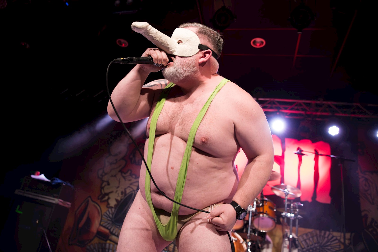 De volgende support komt net als de hoofdact uit Tsjechië. SPASM (7) doet hun eigen soundcheck met normale kleren aan, maar even later zou dat fel veranderen. De drummer en gitarist komen nog vrij normaal in bloot bovenlijf aanzetten, maar de zanger… doet ons fronsen. Deze gezette man komt met enkel een zichtbaar strak aangespannen Borat-string op het podium, plus een masker met een lange penis als neus. Ook hallo. In deze quasi naakte en provocerende outfit brengt hij een arsenaal aan pig squeals en brult hij de hele tent bij elkaar.