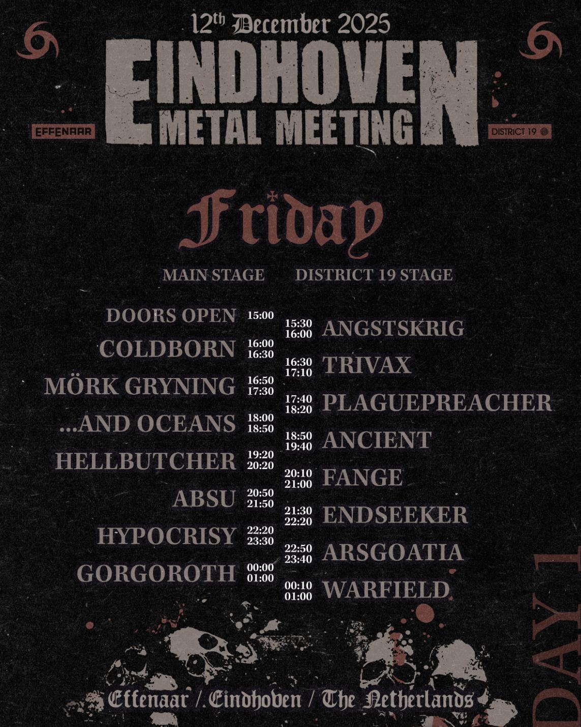 Voor wie er geen genoeg van krijgt, is er op donderdag een officiële Eindhoven Metal Meeting Warm Up Evening in de Effenaar. Die avond staat in het teken van blackened intensiteit, met onder meer Groza, The Spirit en andere soortgelijke acts die de toon zetten voor het festival in een meer clubachtige setting.